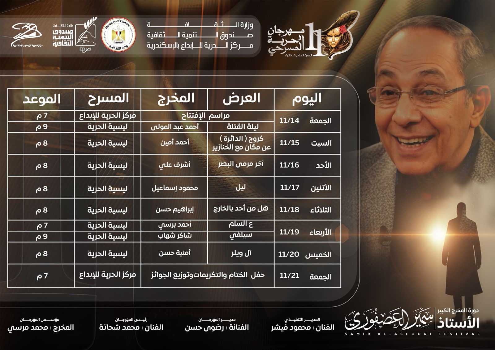 جدول عروض مهرجان الحرية المسرحي الدوره الحادية عشر