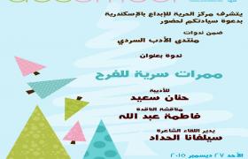 ضمن ندوات منتدى الأدب السردى , ندوة بعنوان " ممرات سرية للفرح  " للأديبه / حنان سعيد , مناقشة الدكتور الناقدة / فاطمة عبد الله , يدير اللقاء الشاعرة / سيلفانا الحداد و ذلك يوم 27 ديسمبر الساعة 7 م